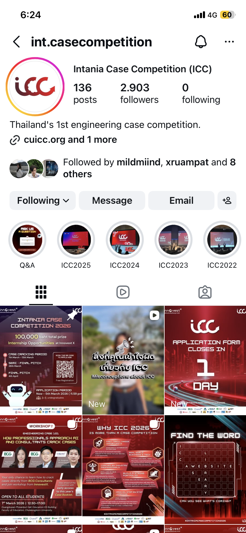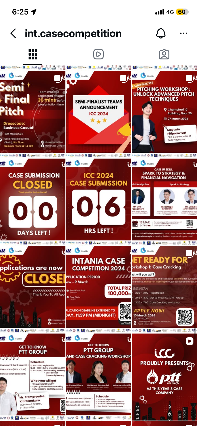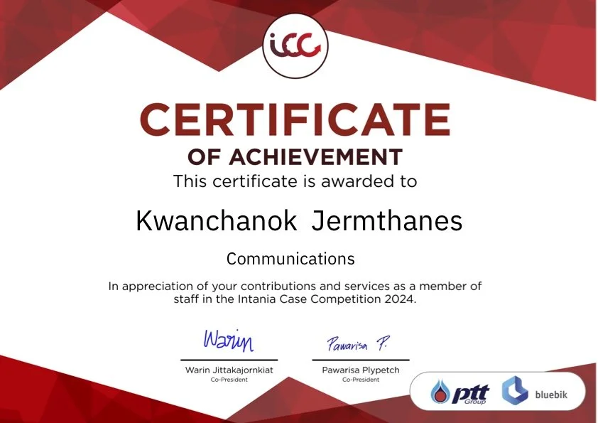 As a Graphic Designer in the Communication Team for the Intania Case Competition 2024, featuring PTT as the case company, I developed visually engaging Instagram content to support the competition’s marketing and communication strategy. I planned and designed promotional posts across different phases of the competition—from the application announcement to the final pitch—ensuring clear messaging and consistent visual storytelling aligned with the event’s professional identity. By applying social media strategy and understanding the target audience of university students, I created content that increased engagement and visibility for the event, successfully attracting 30 applicant teams to participate. Through this experience, I strengthened my skills in content creation, digital marketing, and audience-focused design, while learning how strategic visual communication and social media campaigns can effectively build awareness and drive participation.