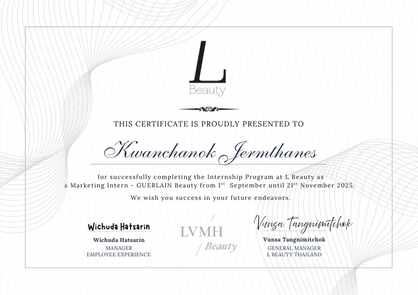 During my internship as a Marketing Intern at Guerlain (L Beauty Thailand), I supported the execution of brand campaigns and product launch activations within the luxury beauty market, focusing on influencer marketing, PR coordination, and event operations. I conducted weekly social media tracking to monitor brand mentions, analyze creator performance, and identify potential KOL partnerships, providing insights to support campaign planning. I also managed PR seeding logistics by preparing and coordinating product deliveries to influencers and media partners to support campaign visibility. In addition, I contributed to product launch activations and brand events, including the launch of VÉTIVER FAUVE at Siam Paragon, where I supported event setup, guest coordination, and operations for over 50 attendees, as well as other exclusive VIP customer events designed to strengthen brand engagement. Through these experiences, I gained hands-on exposure to executing marketing strategies within a global luxury beauty brand and developed a deeper understanding of how influencer partnerships, PR strategies, and immersive brand experiences enhance brand visibility and consumer connection.
